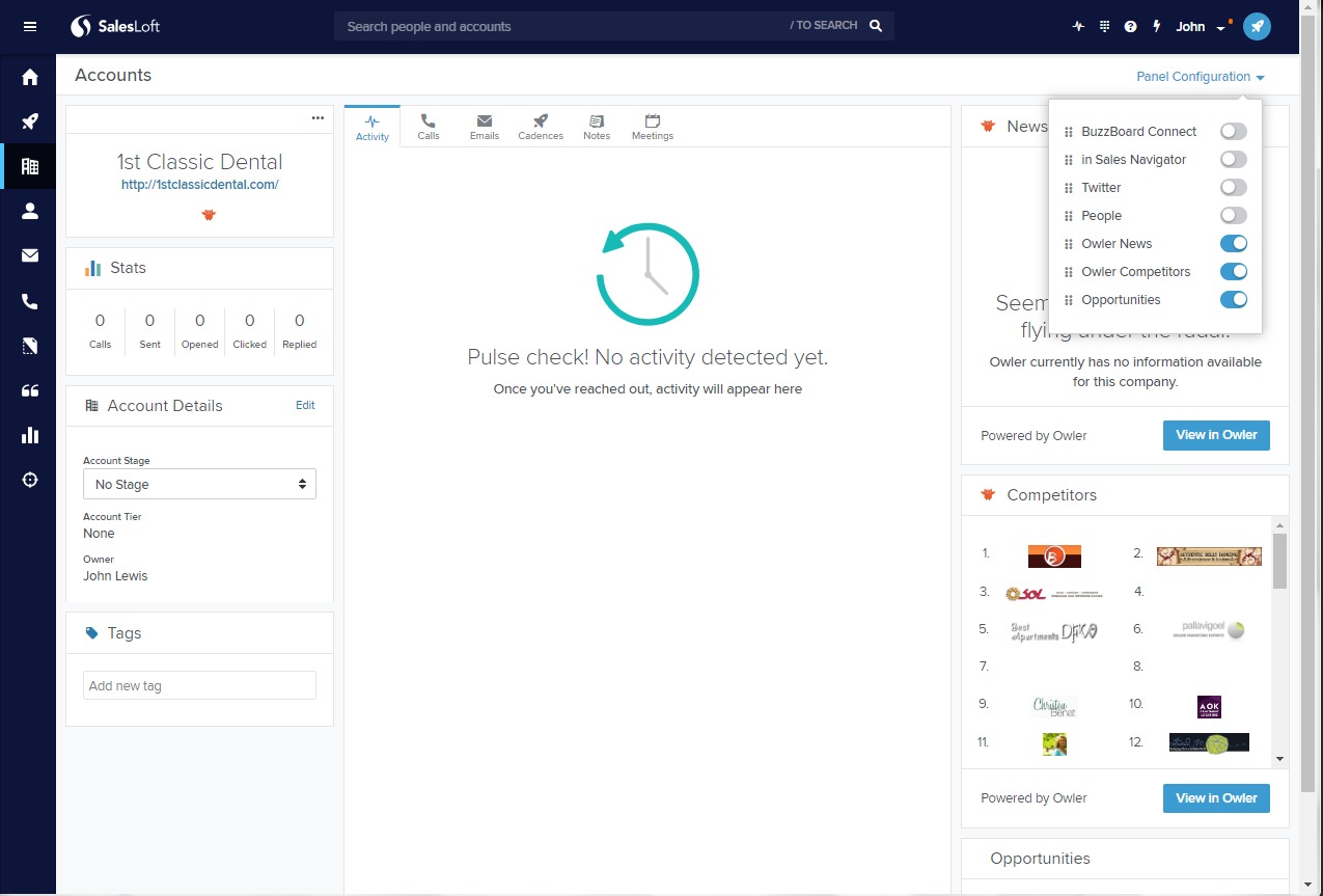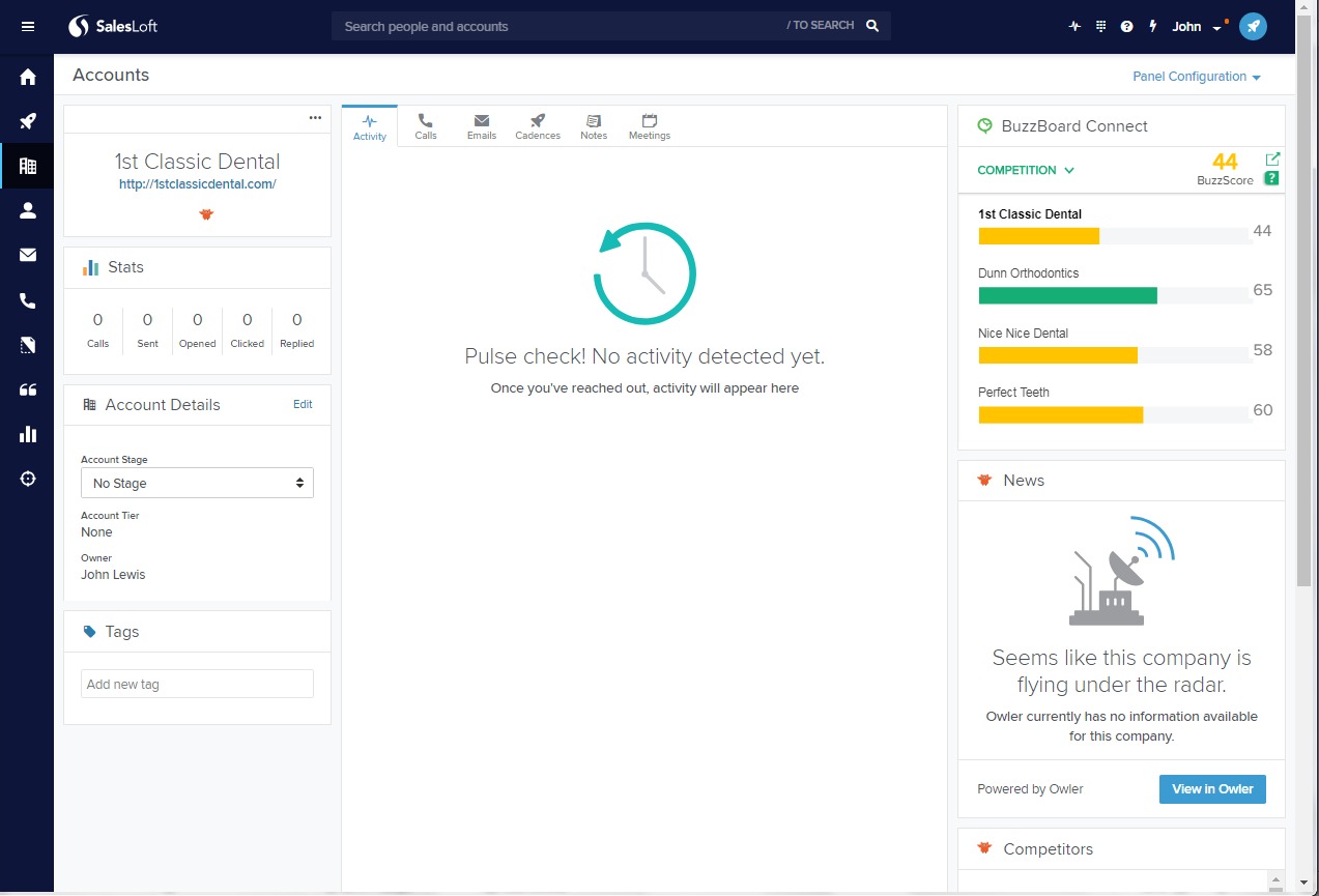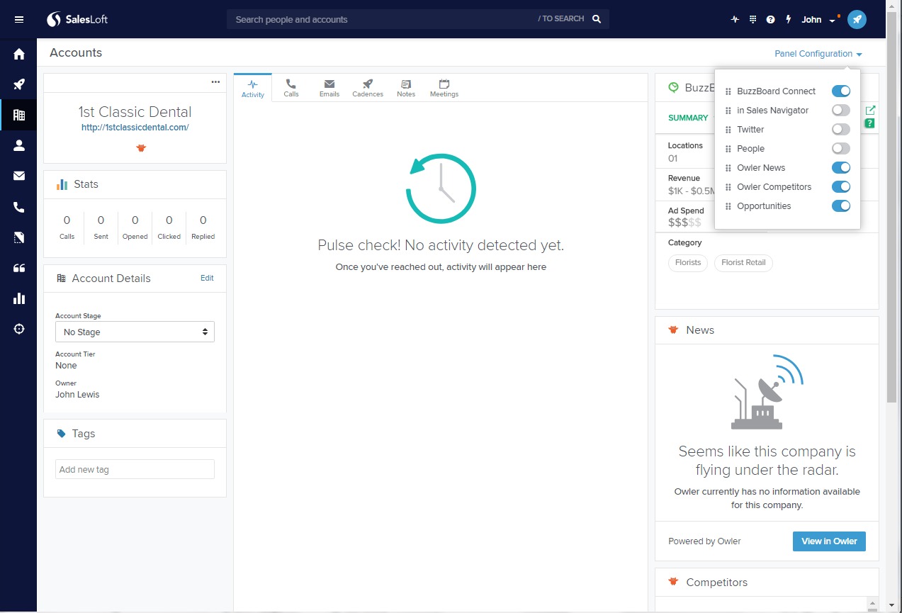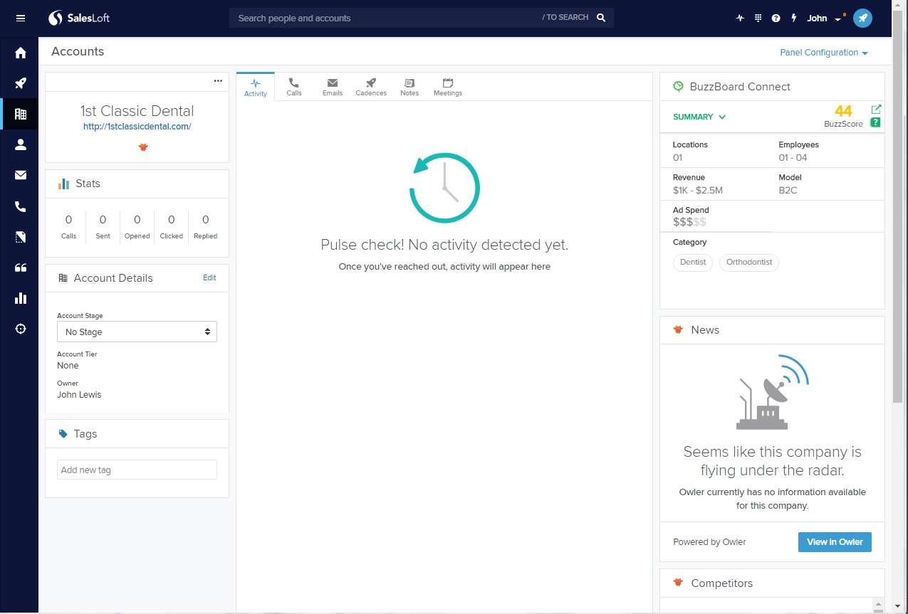 The BuzzBoard Connect card will now appear on the right-hand smart panel, will automatically generate insights into the business, industry, and competition while you are on any of your Account pages.