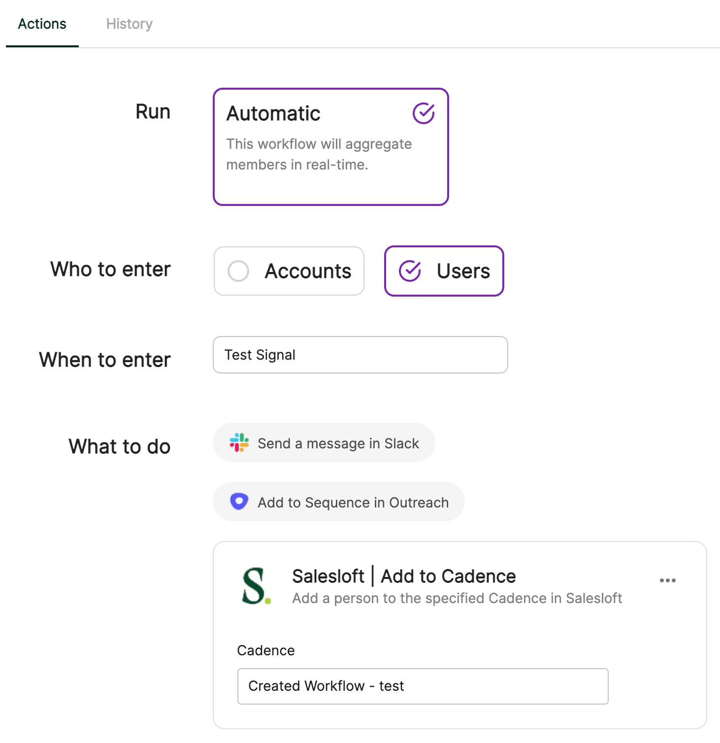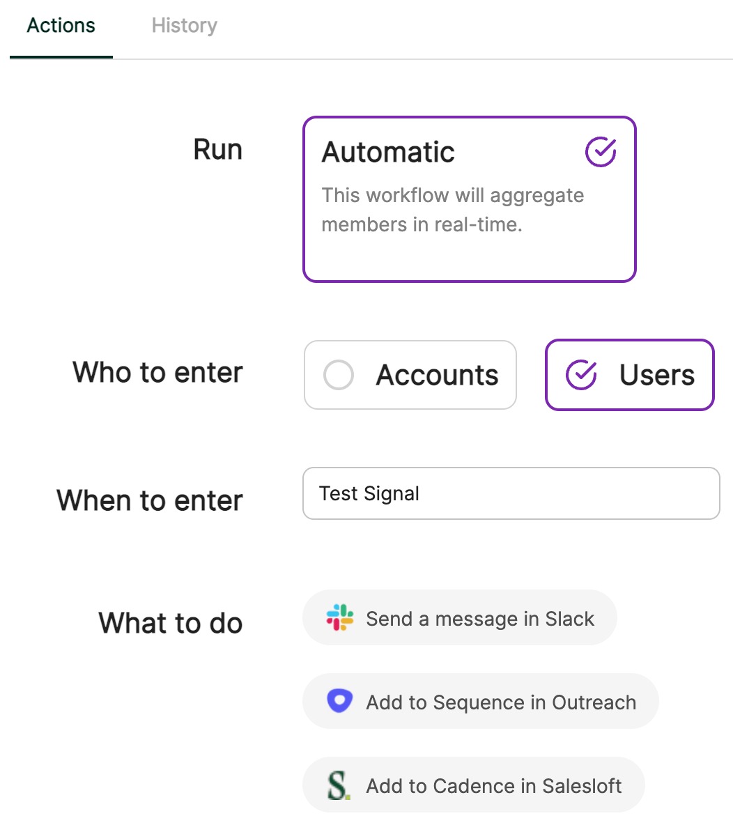 It’s easy to get started with Correlated’s Salesloft integration. Within the Correlated application, you can create a Signal that identifies users that you’re interested in reaching out to. For example, this might be users who have signed in 2x more times this week than last. Next, you can create an automated Workflow, so that any time any user signs in 2x more times in the last week, you can pipe that user into a Workflow. One of the Workflows we support is Salesloft - when a user is piped into Salesloft, we add them to every Step in Day 1 of a Cadence automatically. The user will be linked to the user’s owner in Salesloft. Now, you can create highly personalized Cadences based on what users are doing in your product.