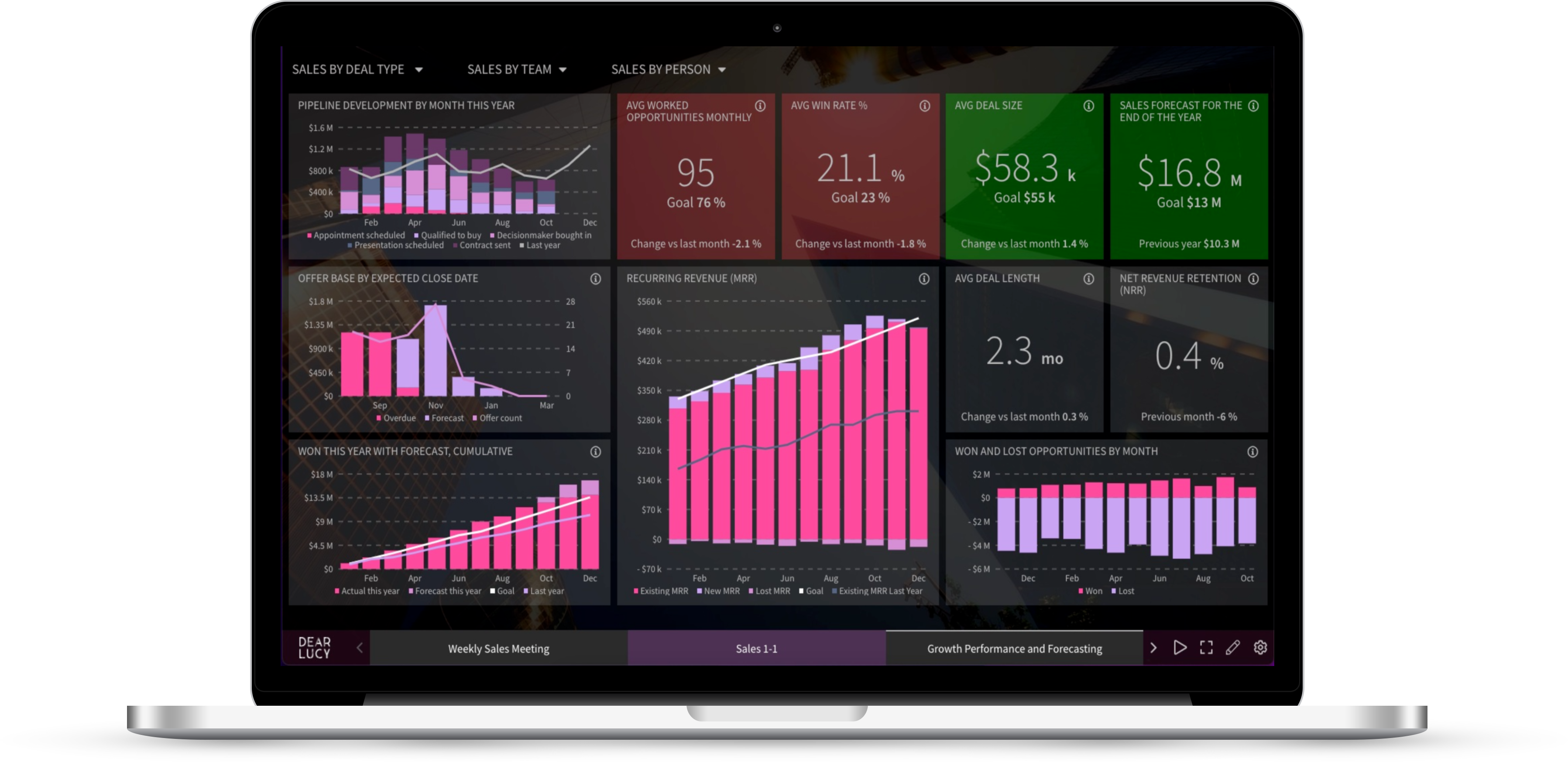 - Pipeline changes, Conversion Funnel, Recurring Revenue with Forecasting