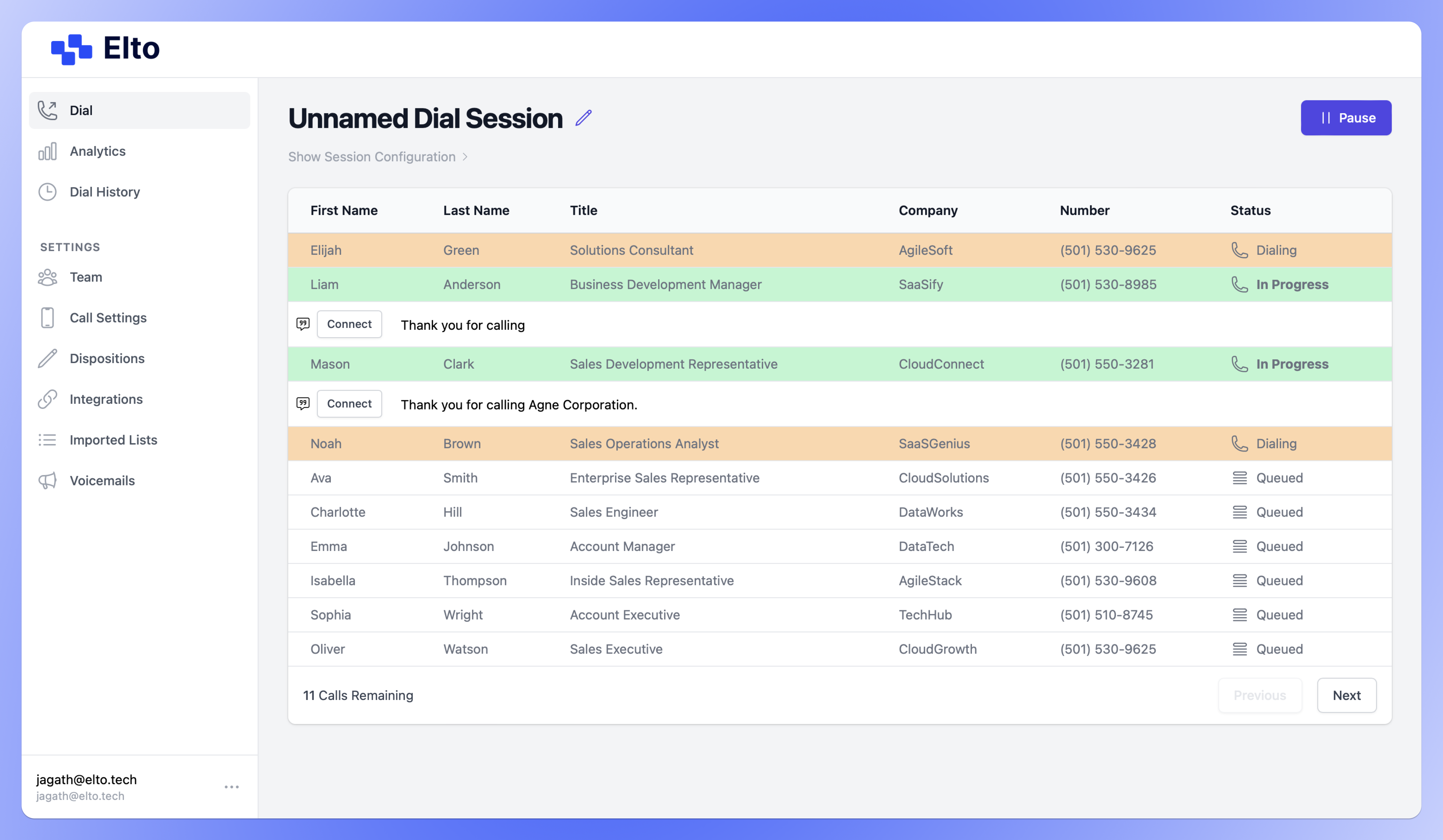 Reps who use Elto hit 5-7x more dials than with any other dialer. Elto's human detection is state-of-the-art, and detects human pickups 30% faster than other leading dialers, resulting in fewer pauses and more engaged conversations.