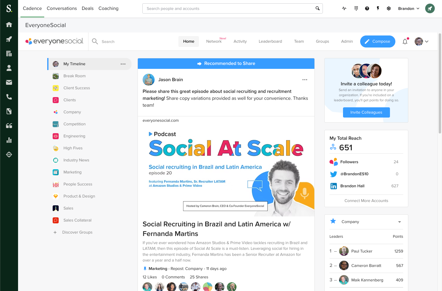 The employee advocacy platform chosen by the world’s leading marketing, sales, recruiting, and communication teams. All your sales social enablement content can now be shared from within Salesloft via the new EveryoneSocial tab.