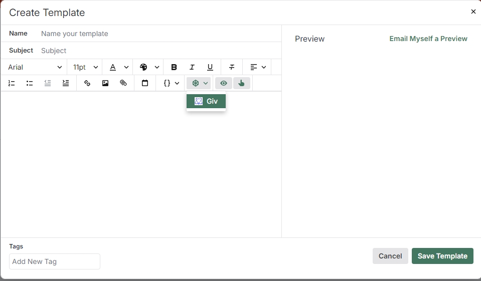 - Once Giv is installed, it will be available in the email templates for all team members. When a team member opens an email template and clicks on the Giv logo, they will be prompted to log in with their Giv credentials only the first time. After this, they won’t need to log in again.