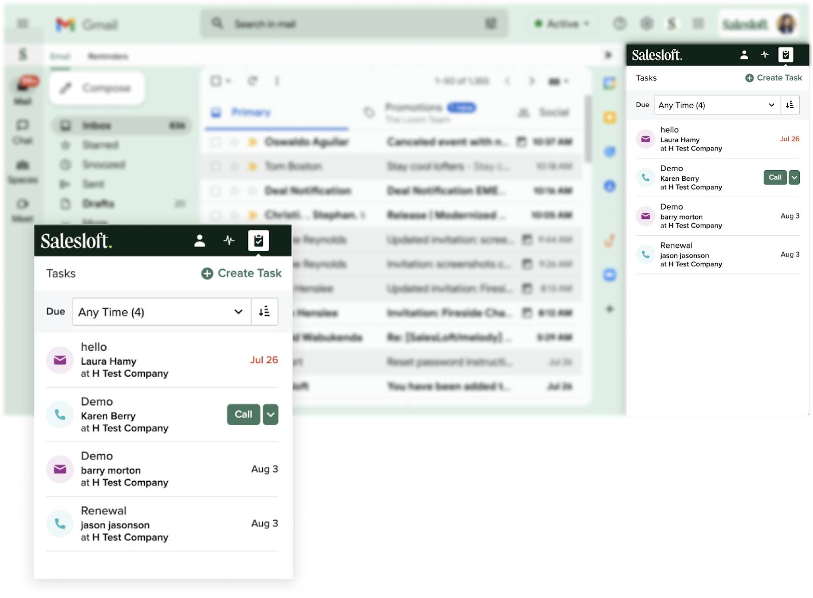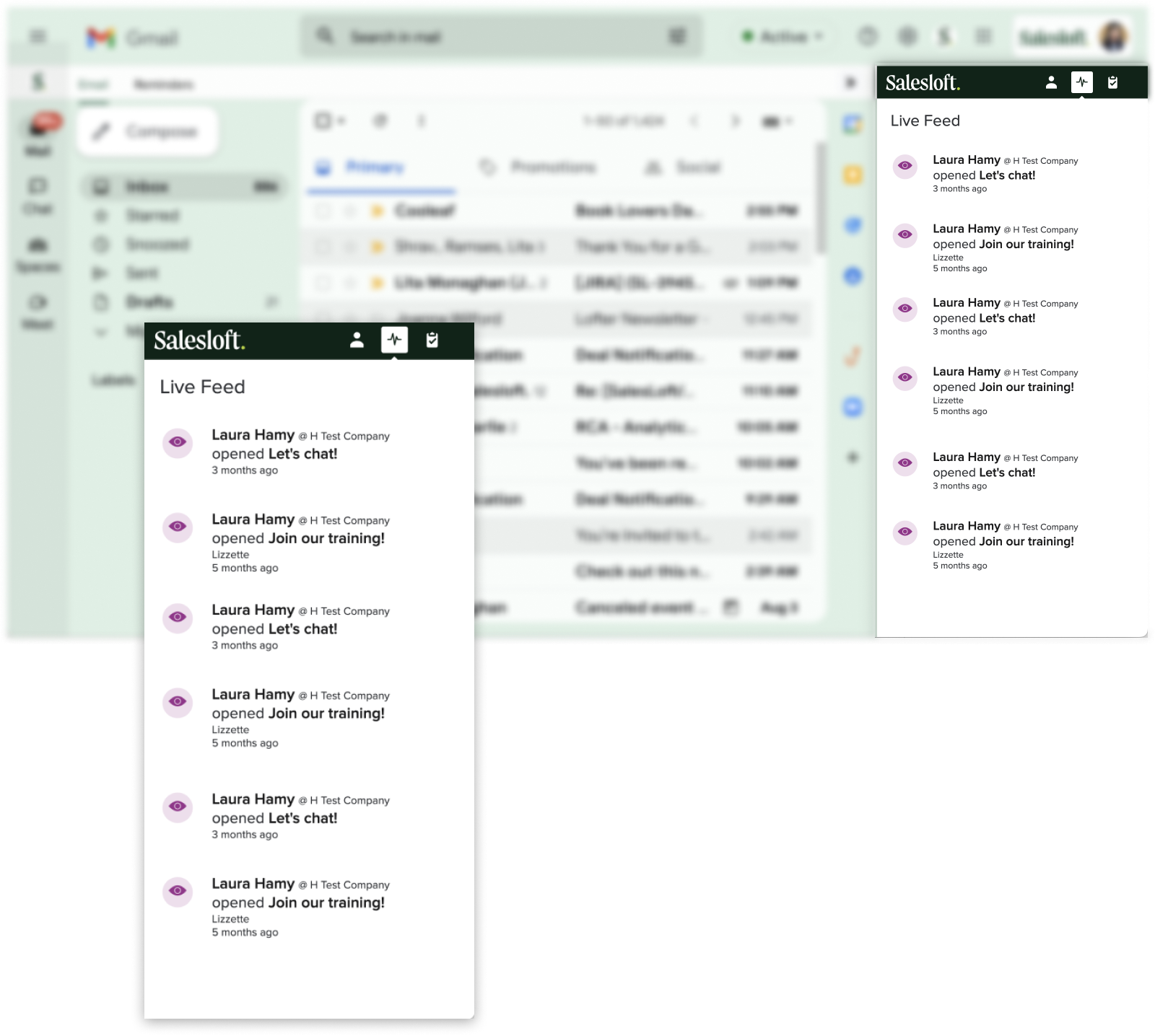 Engaging with your prospects at the right time is crucial for effective sales communication. Salesloft’s live feed gives you real-time updates on your prospect’s activity so you’re never out of the loop. With Salesloft Connect for Gmail, you can access the live feed anytime within gmail, so you never miss a beat in your selling rhythm.