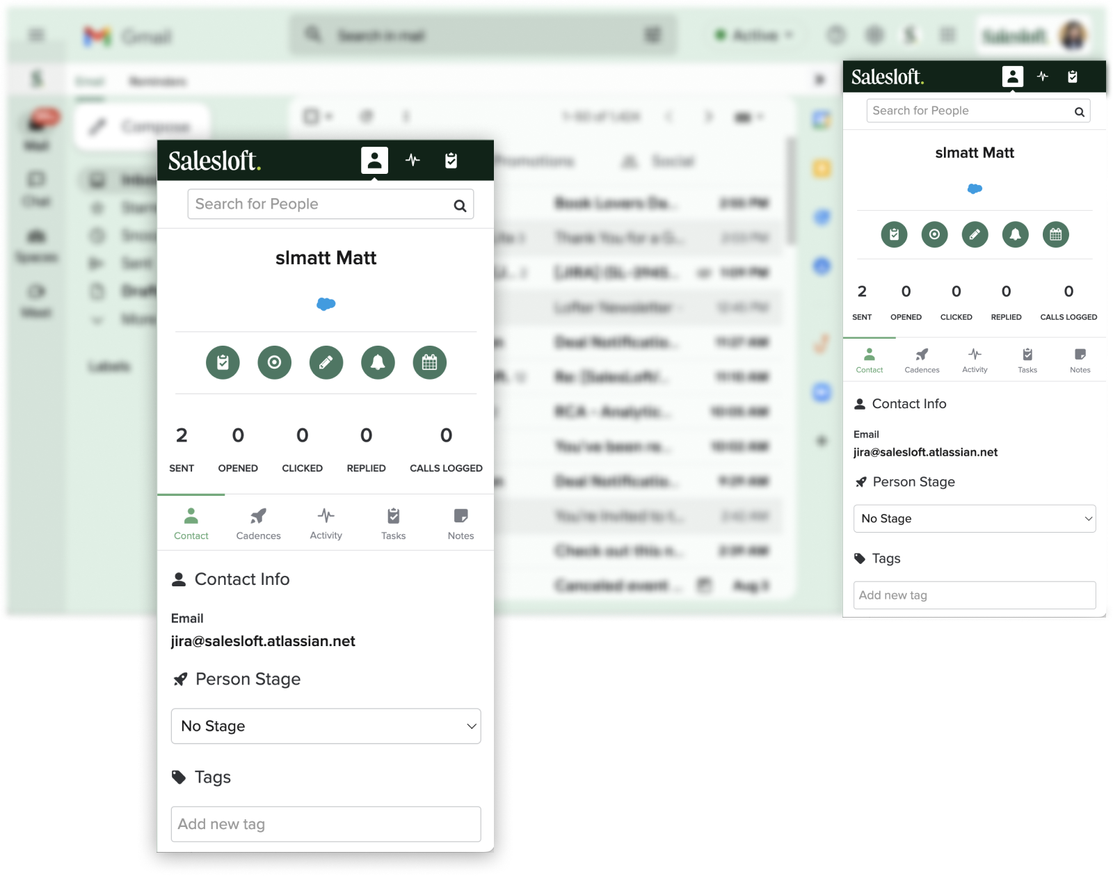 Connect for Gmail understands what information you’ll need based on the context of your email. Relevant information about your contacts is surfaced automatically. View recent prospect activity from Salesforce and Salesloft, get quick links to social profiles, emails, and phone numbers, and view recent engagements and cadence activity.
