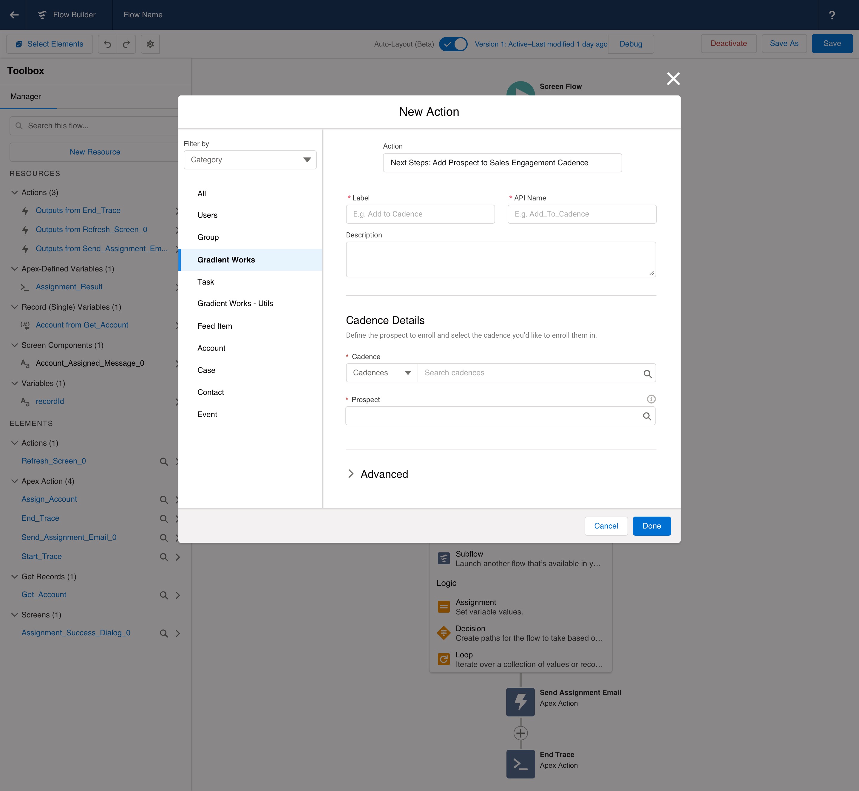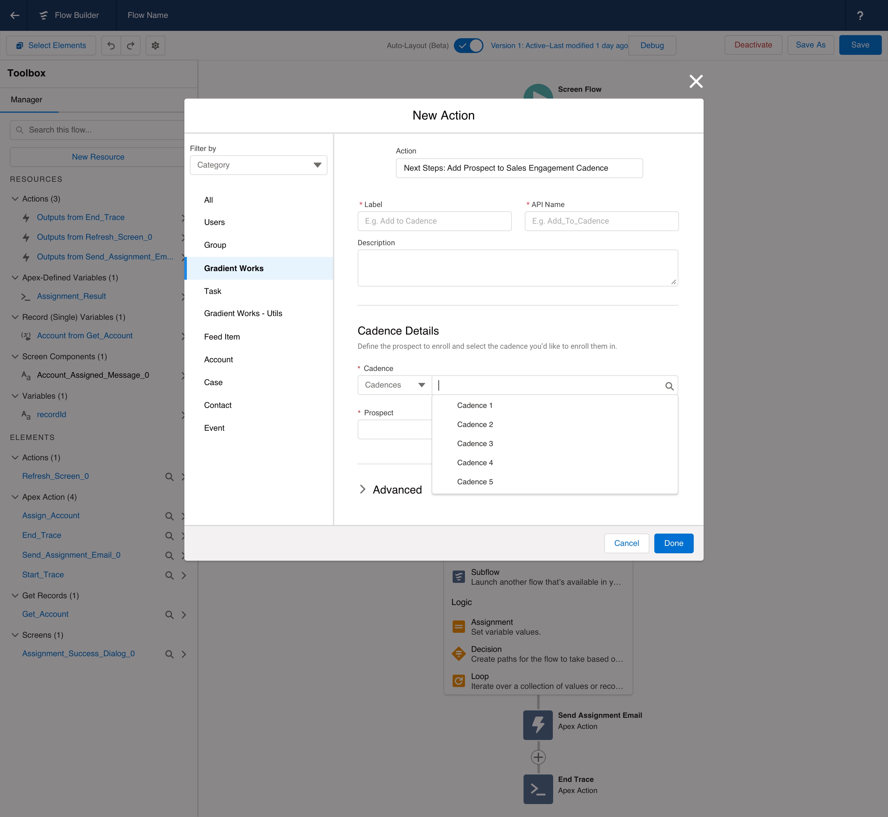 The Gradient Works Salesloft integration allows you to connect Salesloft directly with your Salesforce instance. Alongside our Next Step actions, this integration will allow you to: * Add users to your cadences * Verify if a user already exists in a cadence before adding