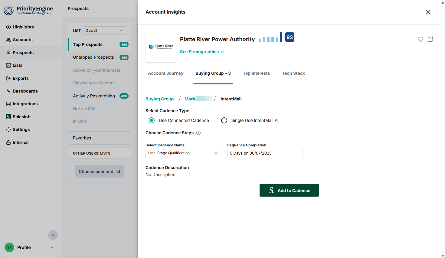 - Instantly add Active Prospects directly into relevant Salesloft cadences with one clickÂ