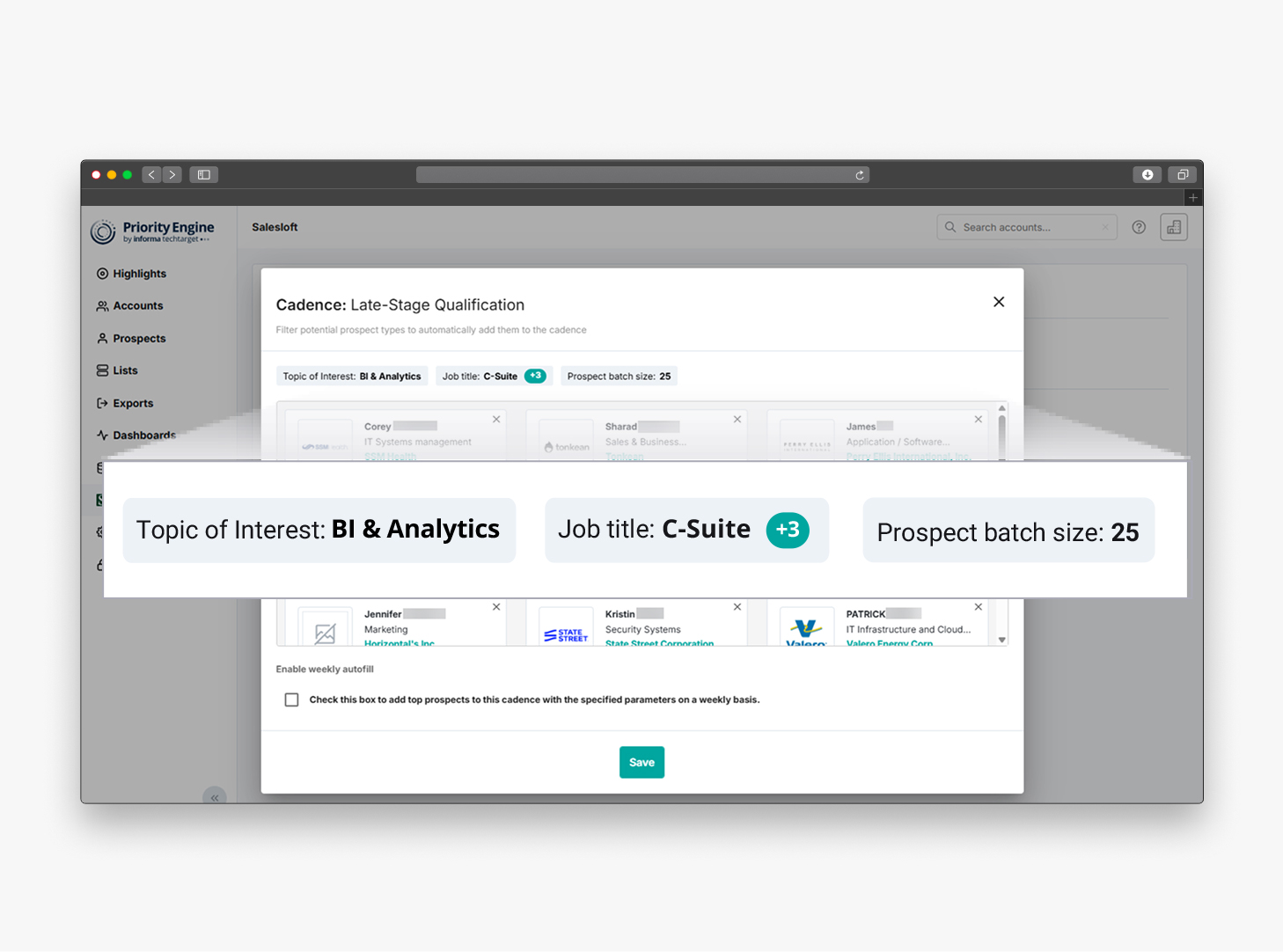 - Automatically export Active Prospects to topically aligned Salesloft cadences on a weekly basis