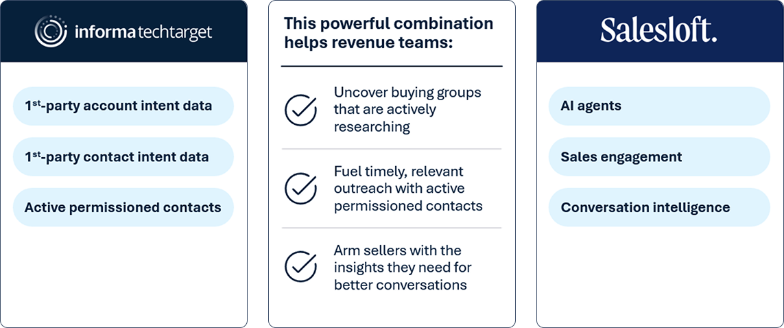 Informa TechTarget continuously identifies new contacts from in-market accounts who are researching relevant topics across our network. These aren't just any contacts – they're permissioned buyers who can be contacted by email and phone. By automatically adding these Active Prospects into topically aligned Salesloft cadences, your sellers can take immediate and relevant action on in-market buyers, helping them get into deals earlier.