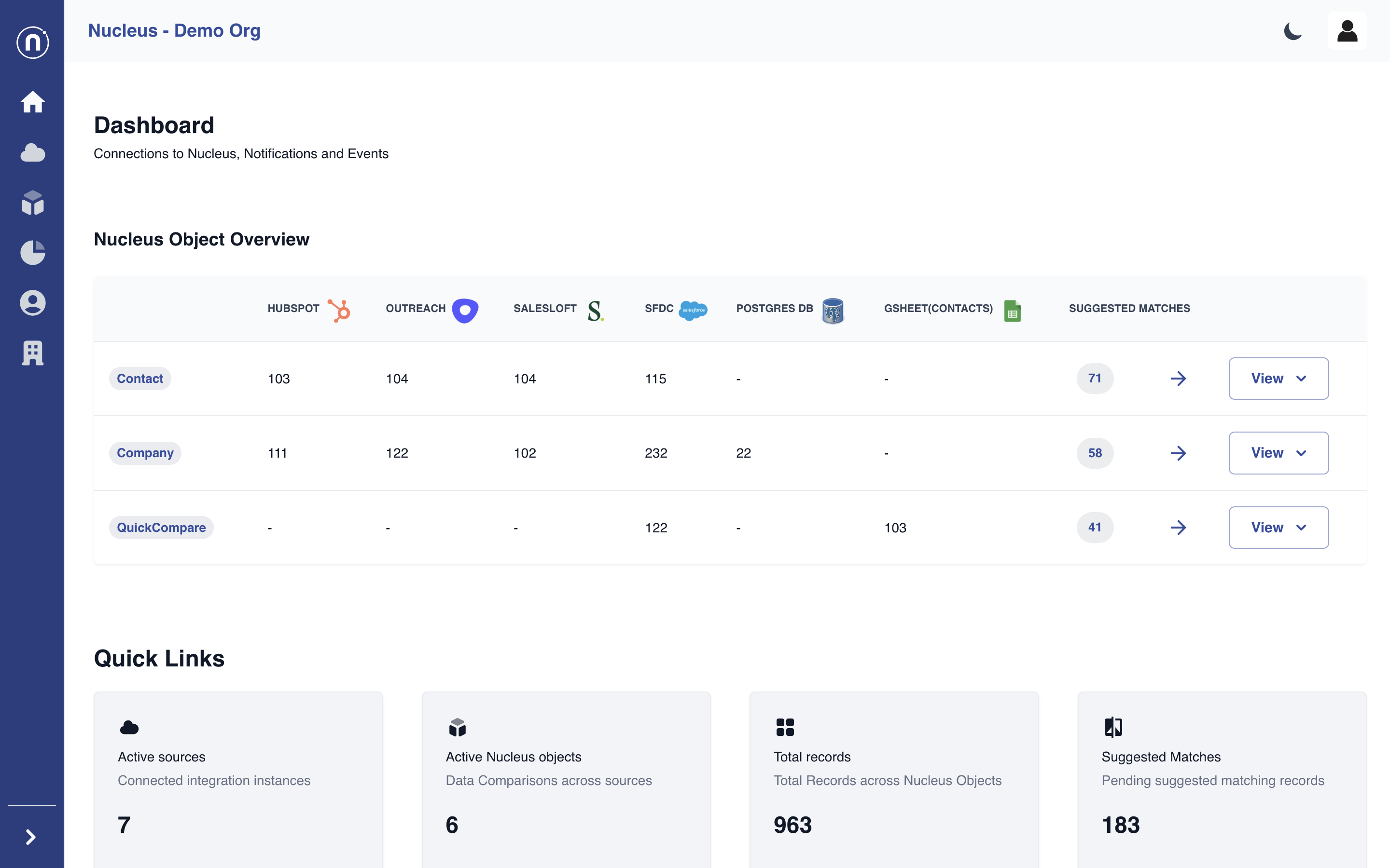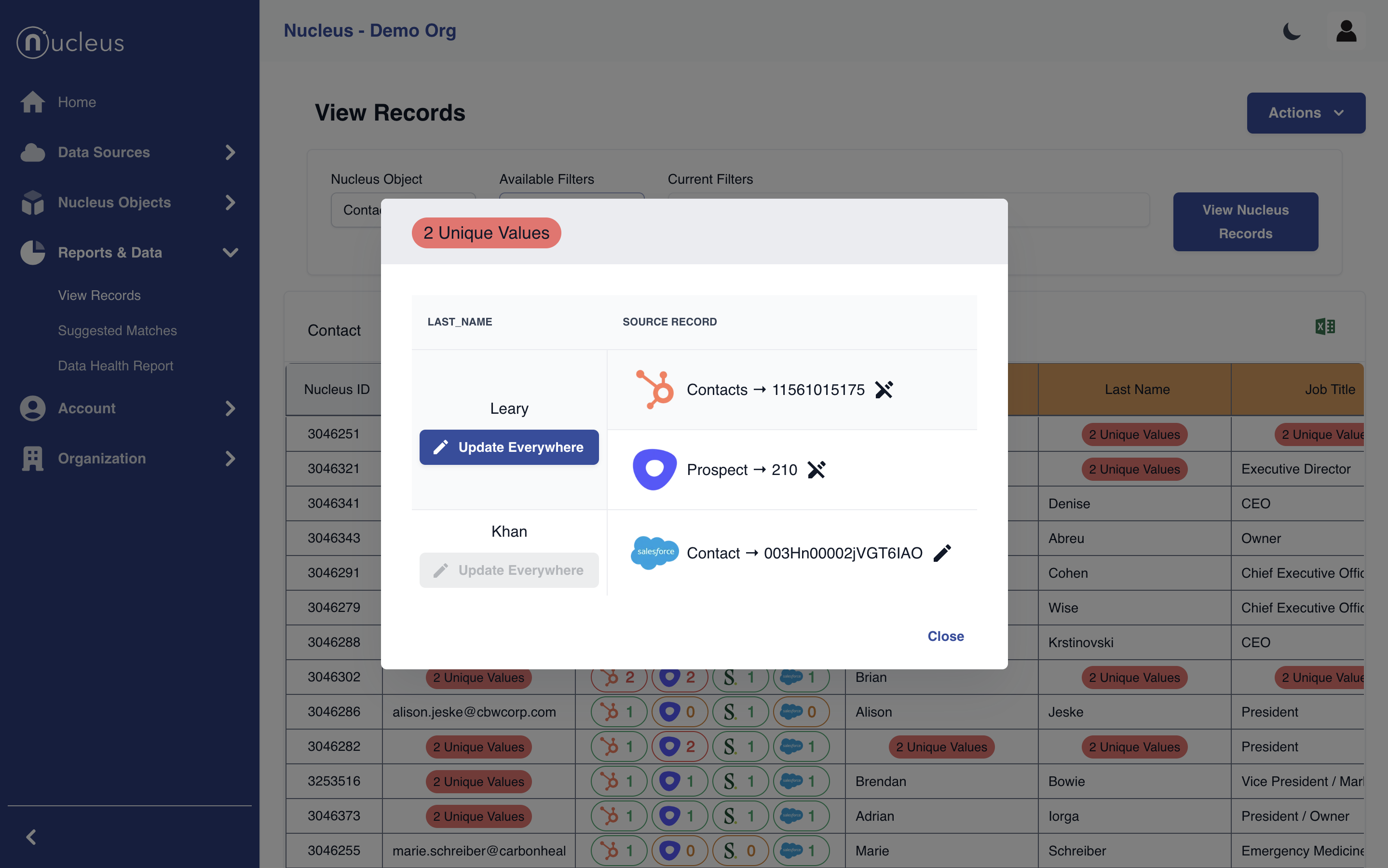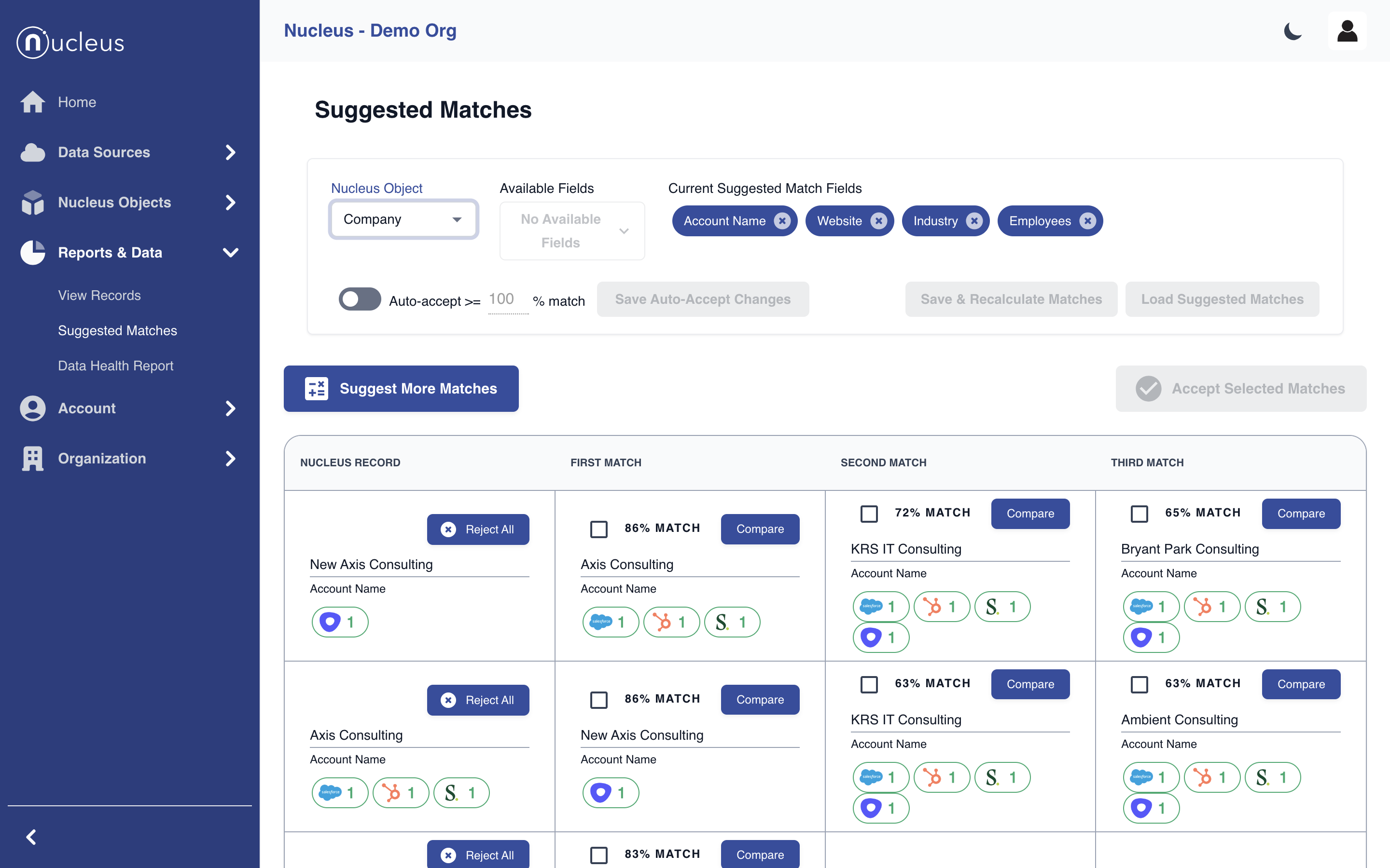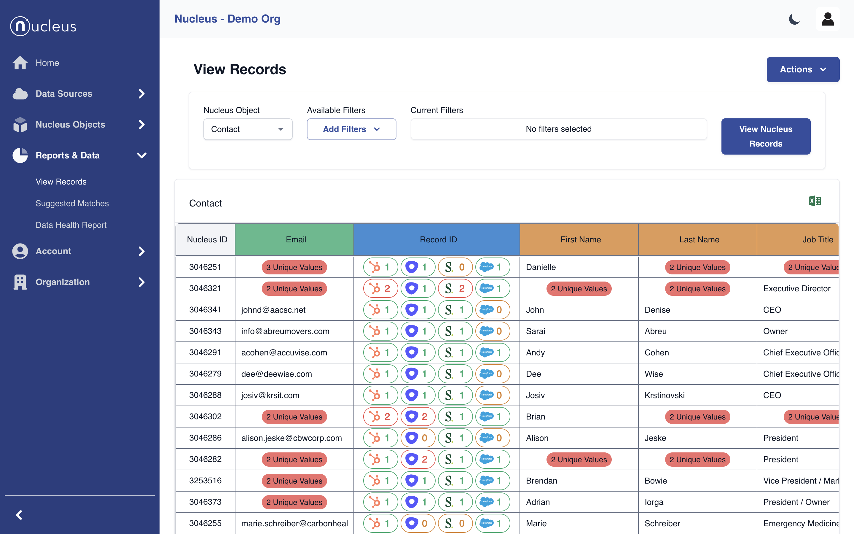 Nucleus helps you dedupe, clean and align your data within Salesloft or to other integrations like SFDC, Hubspot or 3rd party databases.