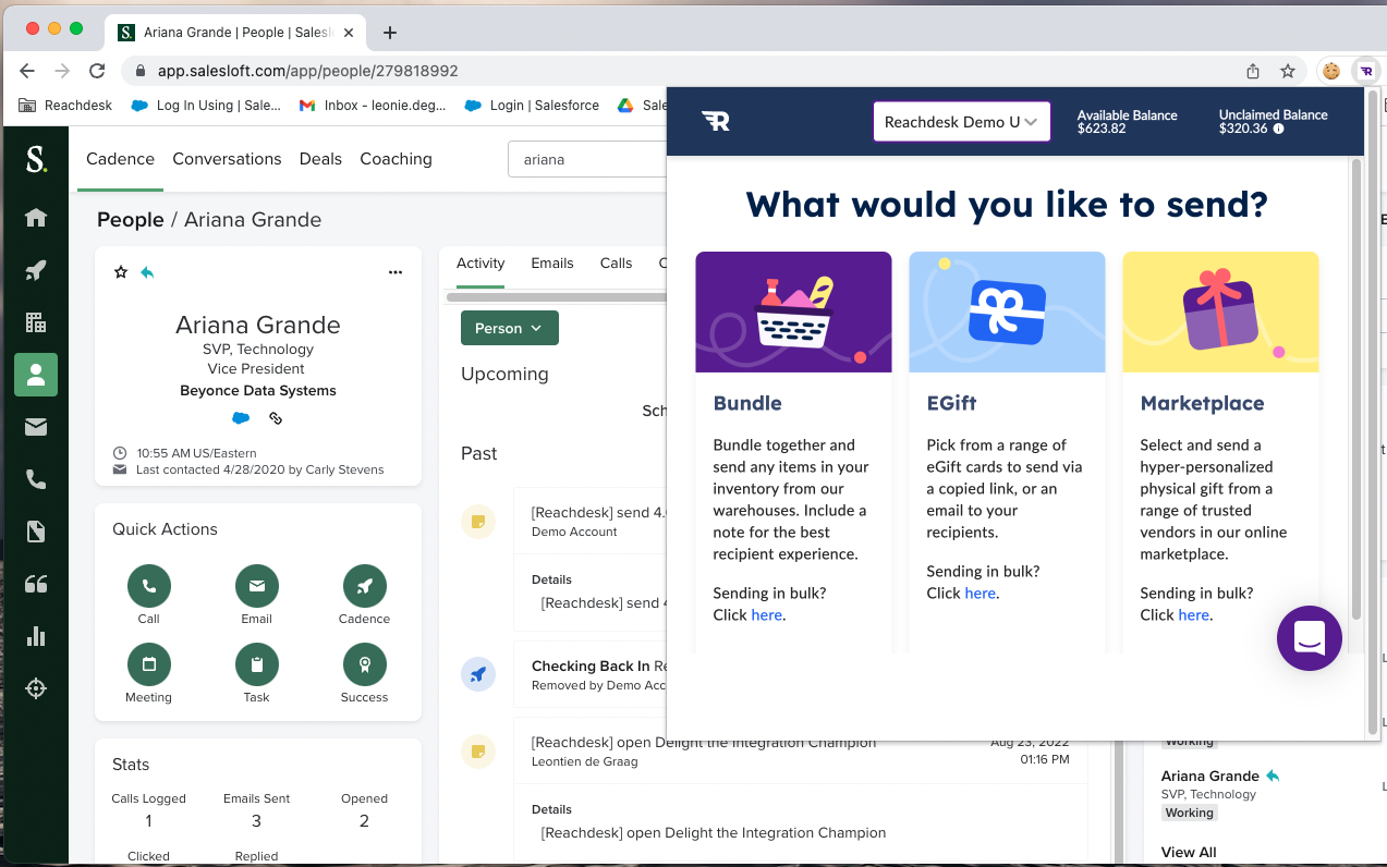 - Send gifts and packages directly from Salesloft: Make life as easy as possible for your reps by sending Reachdesk Gifting campaigns directly from Salesloft on a 1-to-1 basis.