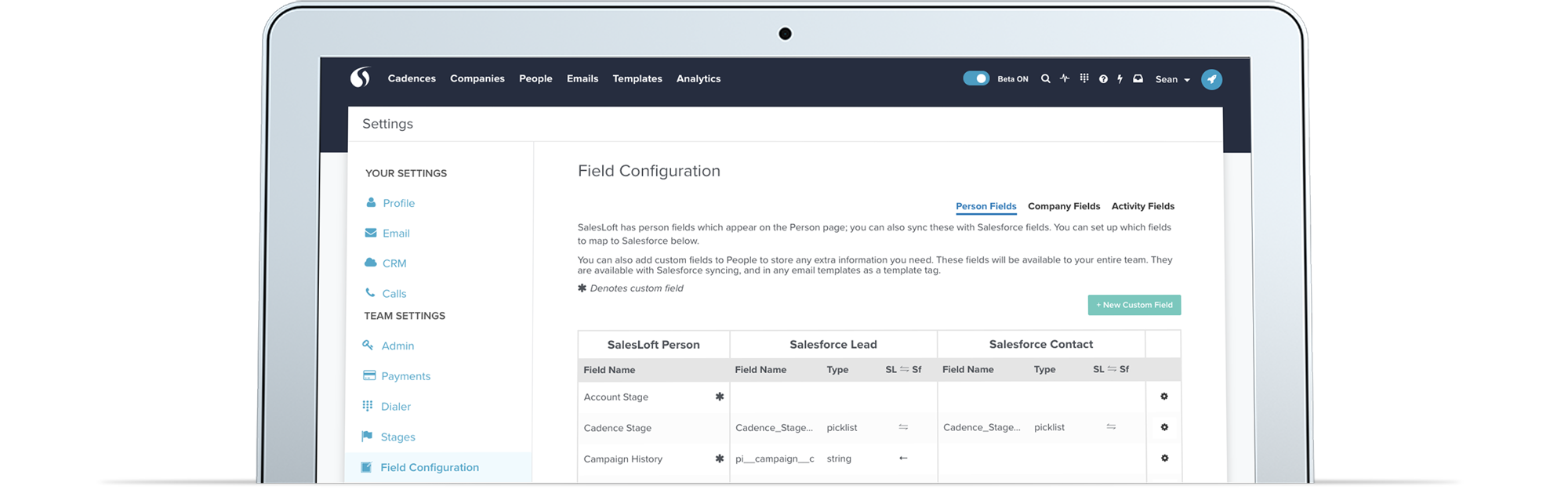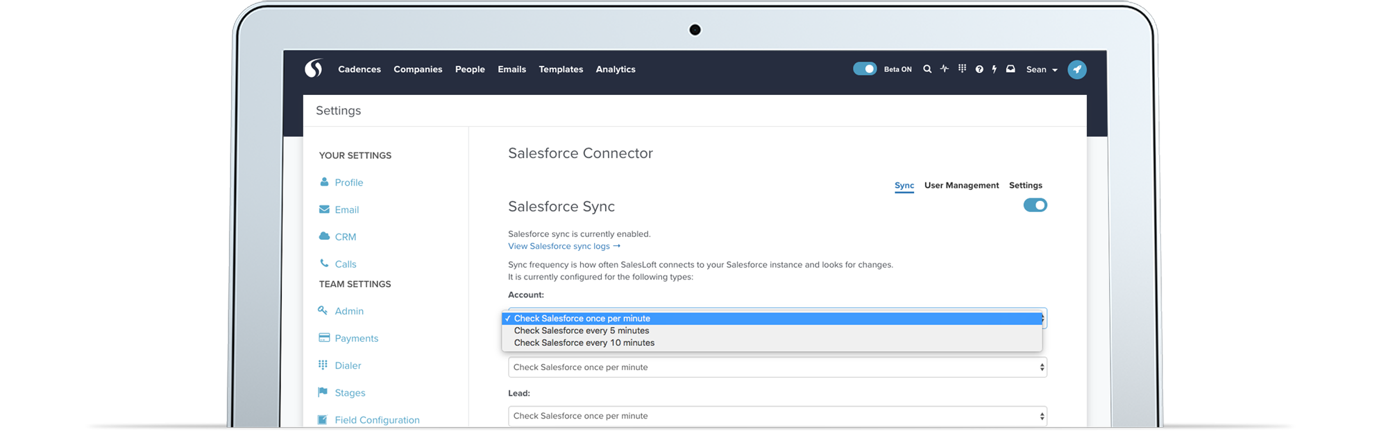 Auto-map standard fields from your CRM to Salesloft and easily set up your team’s instance in no time. Administrators have the ability to choose which platform takes the priority for each data field while syncing.Â