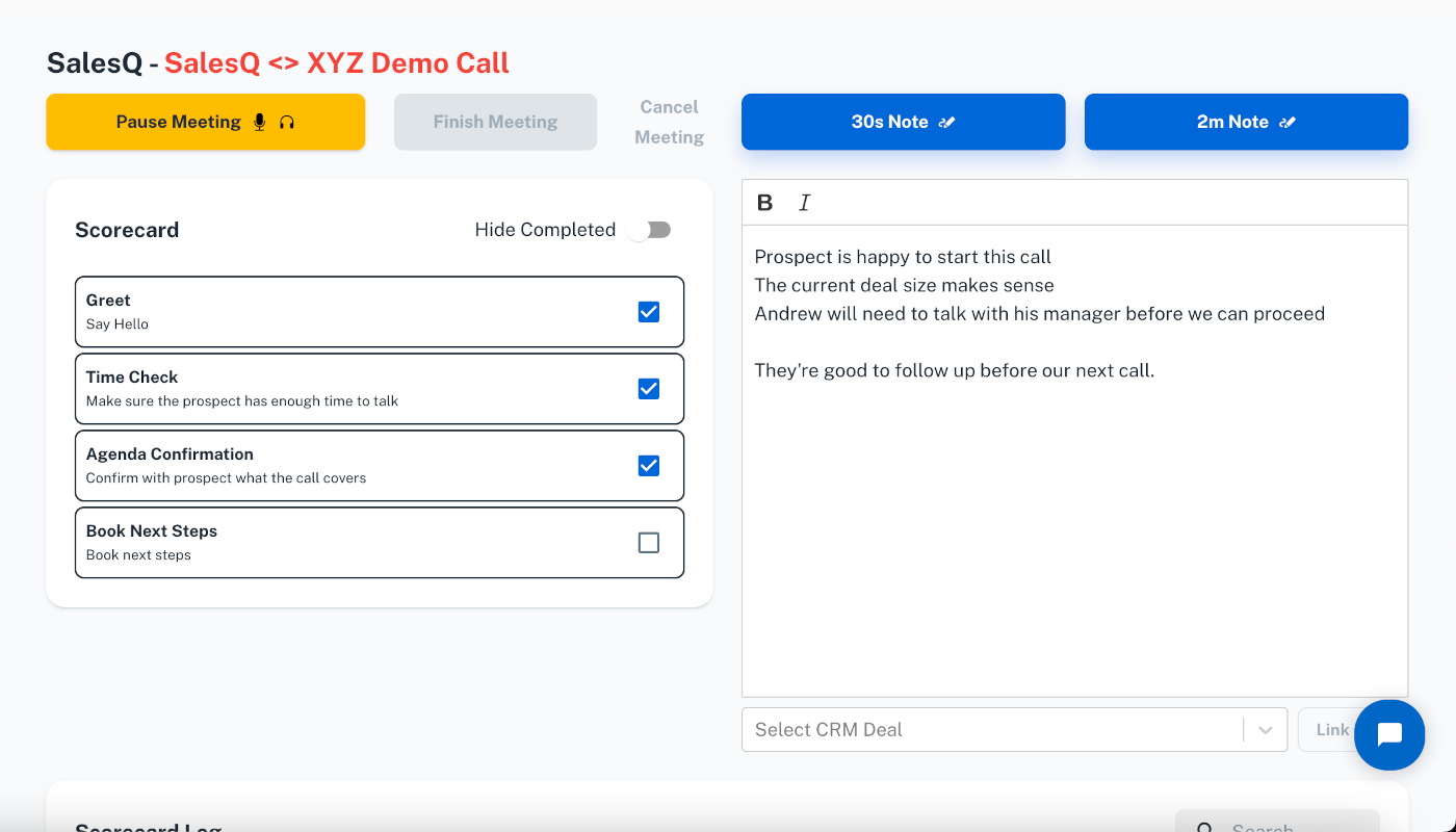 Use SalesQ notes to document important information. When the call is complete, select a Salesloft account. SalesQ will automatically push notes into Salesloft.