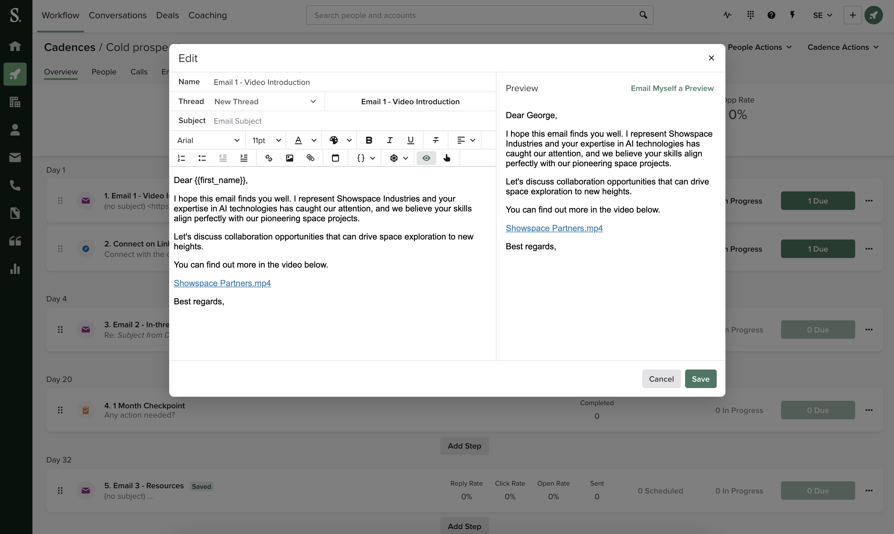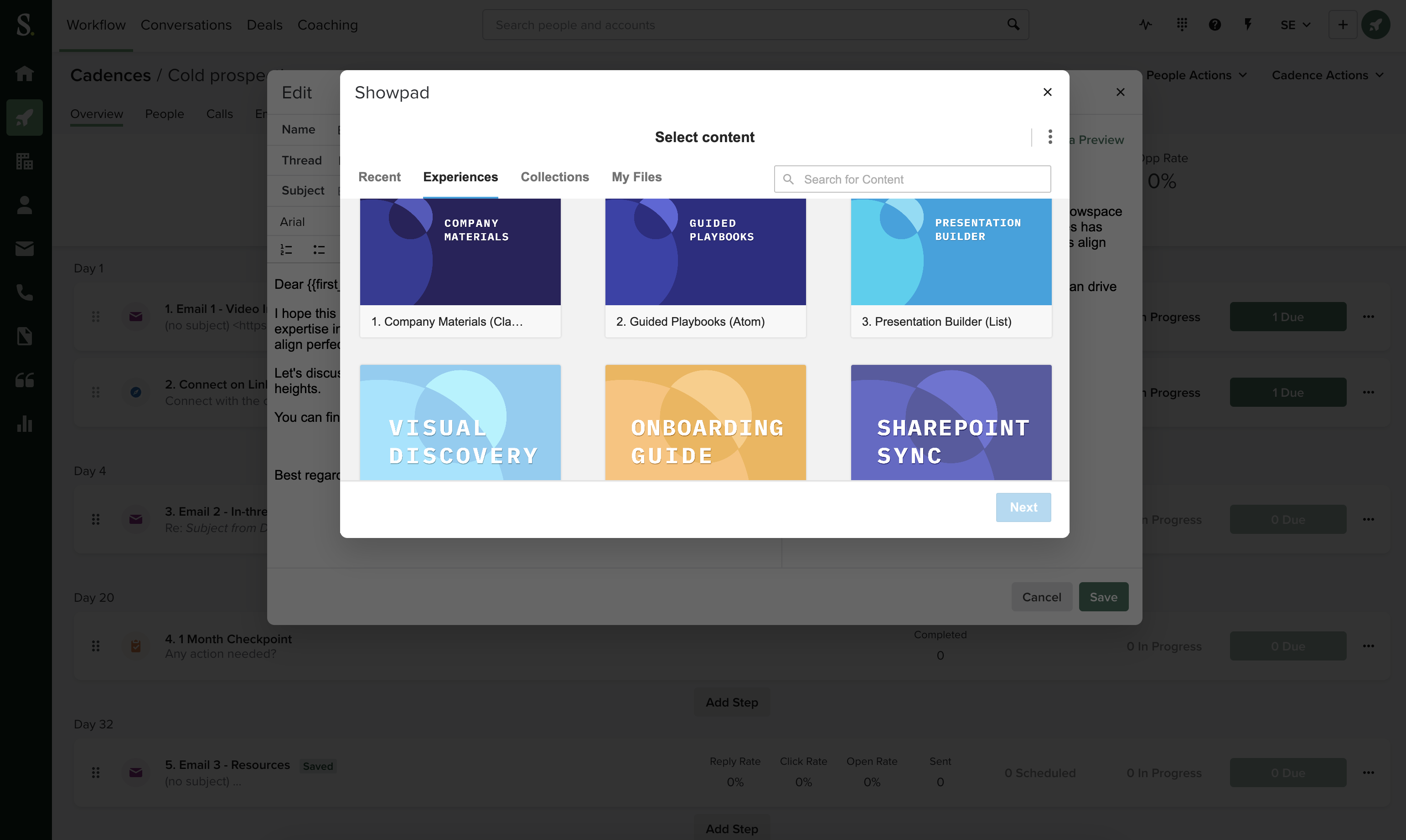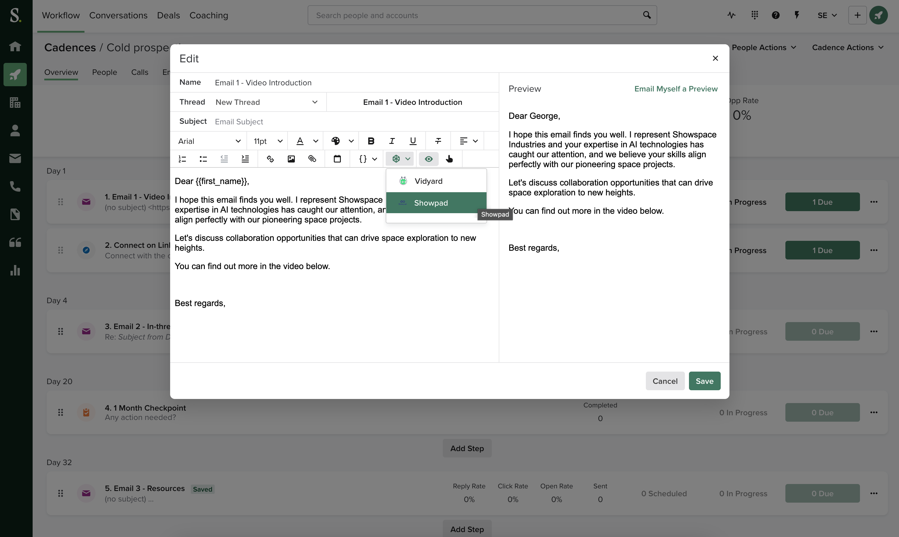 - Enrich emails, sequences, and templates quickly, with assets managed in Showpad directly from the Salesloft email composer.