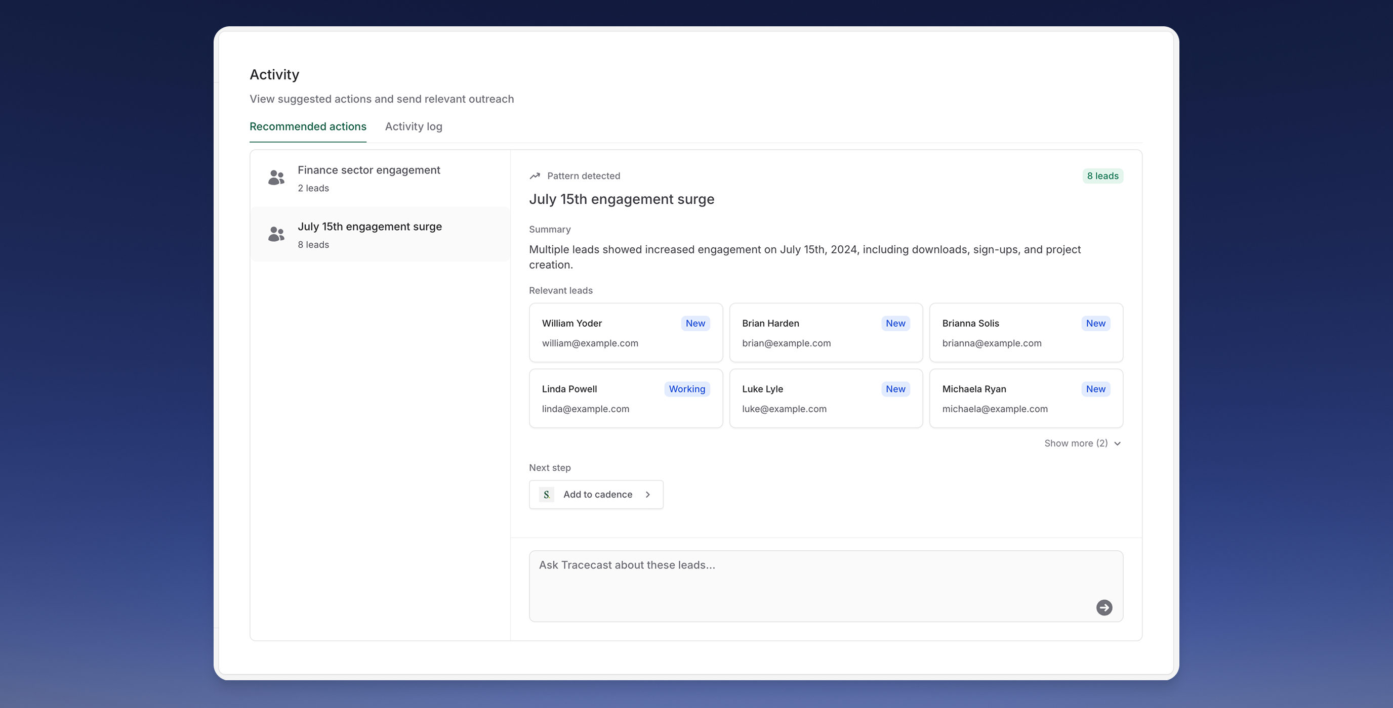 - Review AI-Generated Insights: Access lead stories, personas, and engagement trends automatically identified by Tracecast