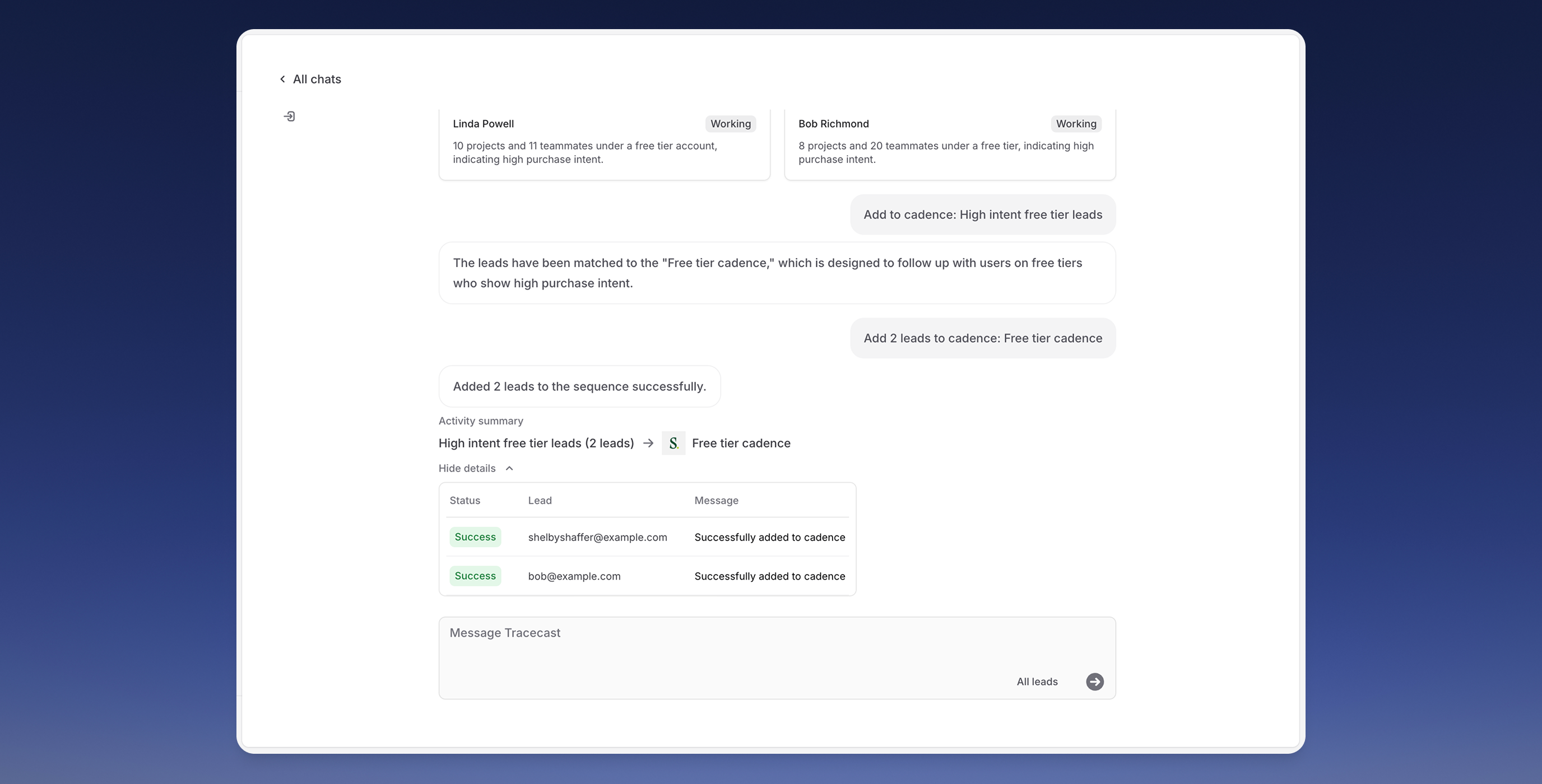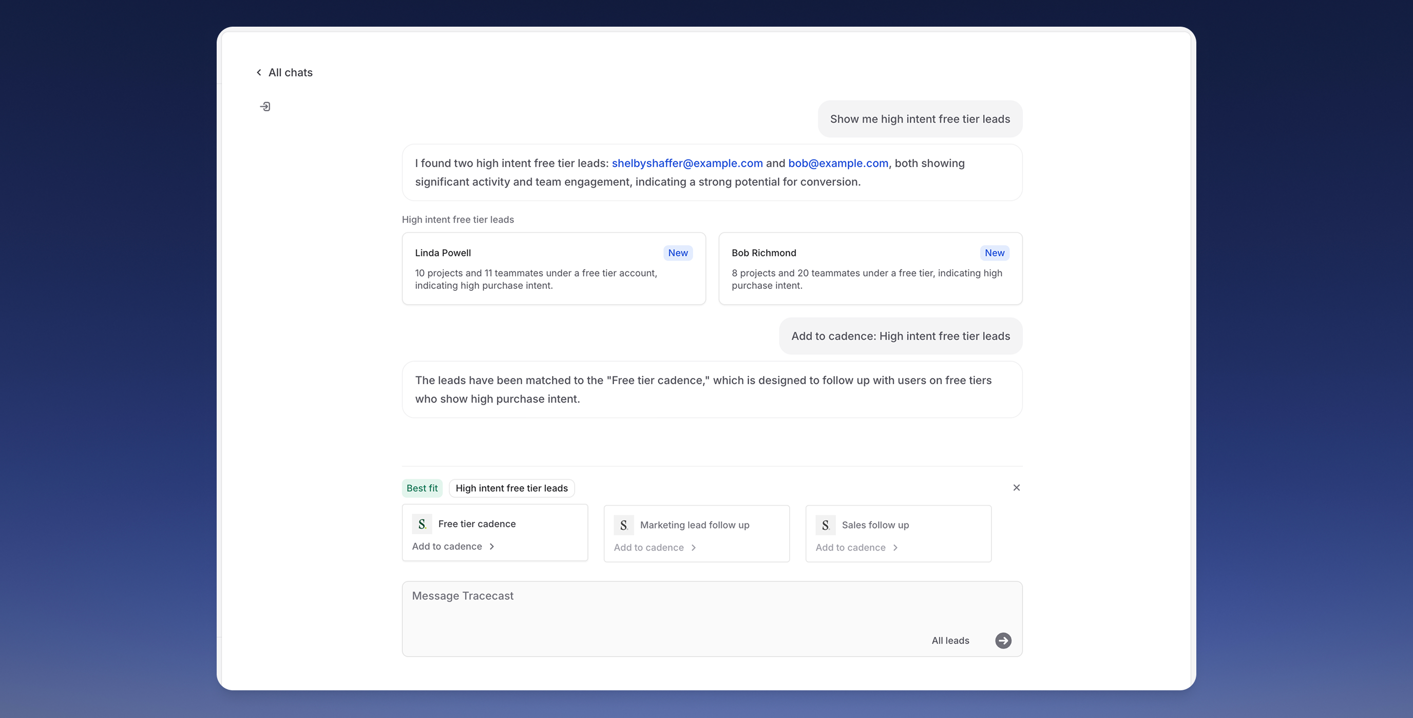 - Query Your Data: Use Tracecast's AI chat to find relevant prospects across any dimension