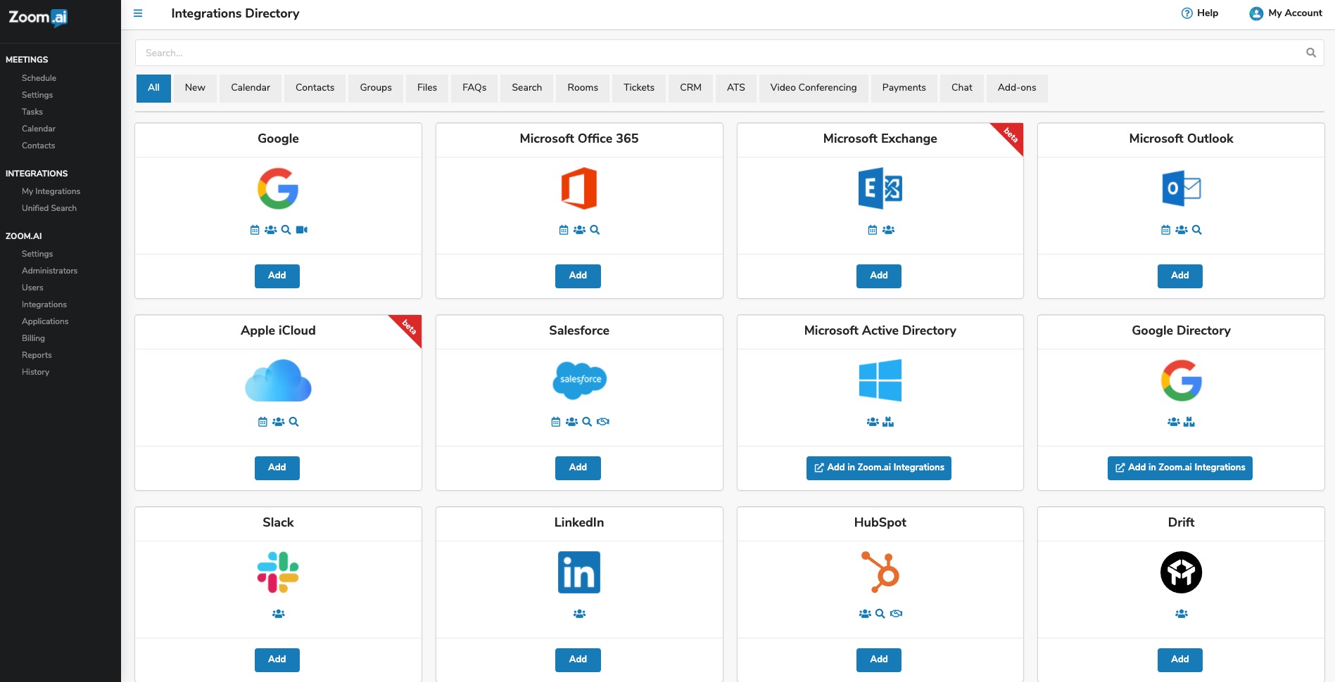 The Zoom.ai Meeting Assistant connects to a user's calendar when that user's first registers. The user can then optionally authorize access to their office applications and other work applications for additional functionality.